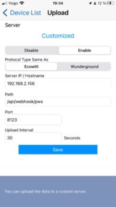 Esta es la configuración que debemos aplicar en la estación meteorológica mediante su aplicación desde el móvil. Un servidor personalizado (Customized) que será nuestra instalación de Home Assistant.